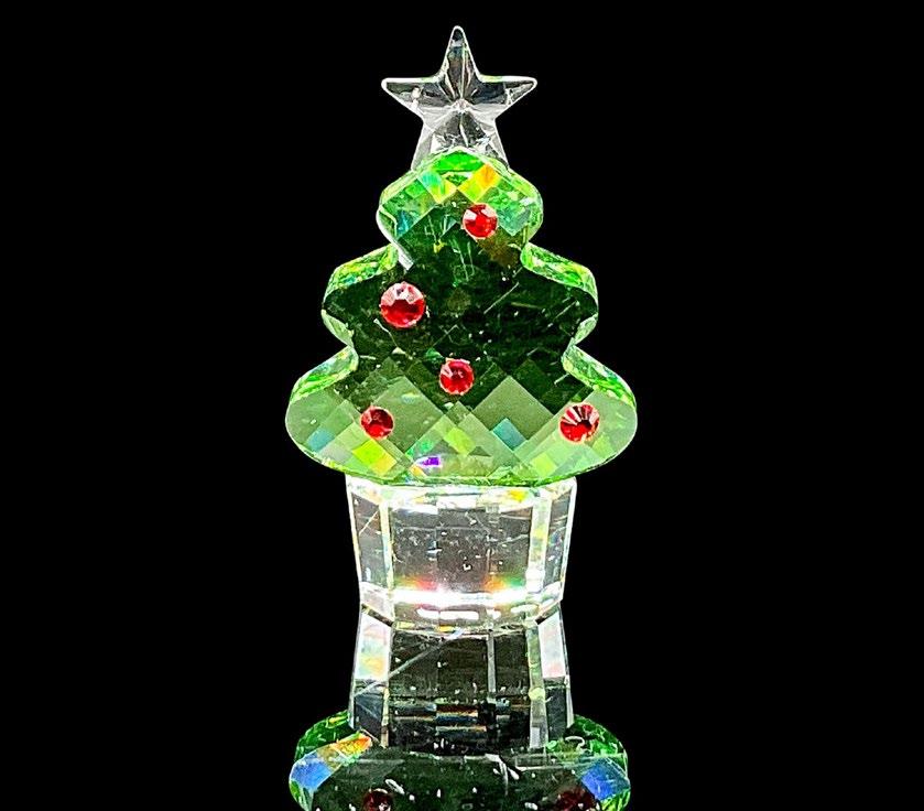 Sparkling green Christmas tree with red crystal accents. Swarovski etched backstamp. Includes original box 3”L x 3”W x 1.5”H. Small display mirror and Certificate of Authenticity included.