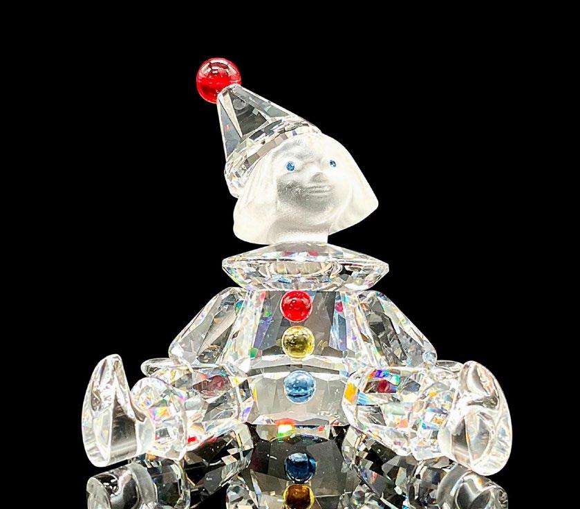 Part of When We Were Young group. Clear clown outfit and hat with red, yellow and blue crystal buttons and pom. Blue inset eyes. Swarovski backstamp. 7550 000 003. This item has its original box: 4.75”L x 4.75”W x 3”H.