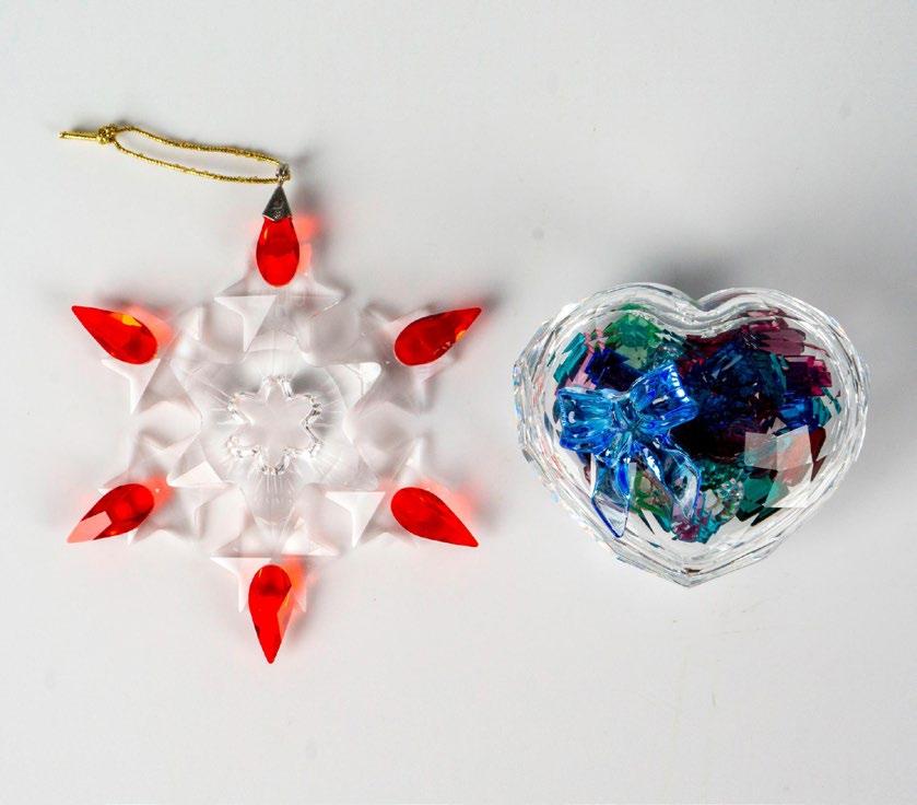 Includes Christmas Ornament 2010 with box, and Jewel Sweetheart box with loose colorful crystal gems. Swarovski marked. Ornament: 2010; 3”W x 3.5”H; box: 6.5”L x 5.75”W x 1”H. Sweetheart box: c. 1998-2001; 2.25”L x 2.25”W x 1.75”H.
