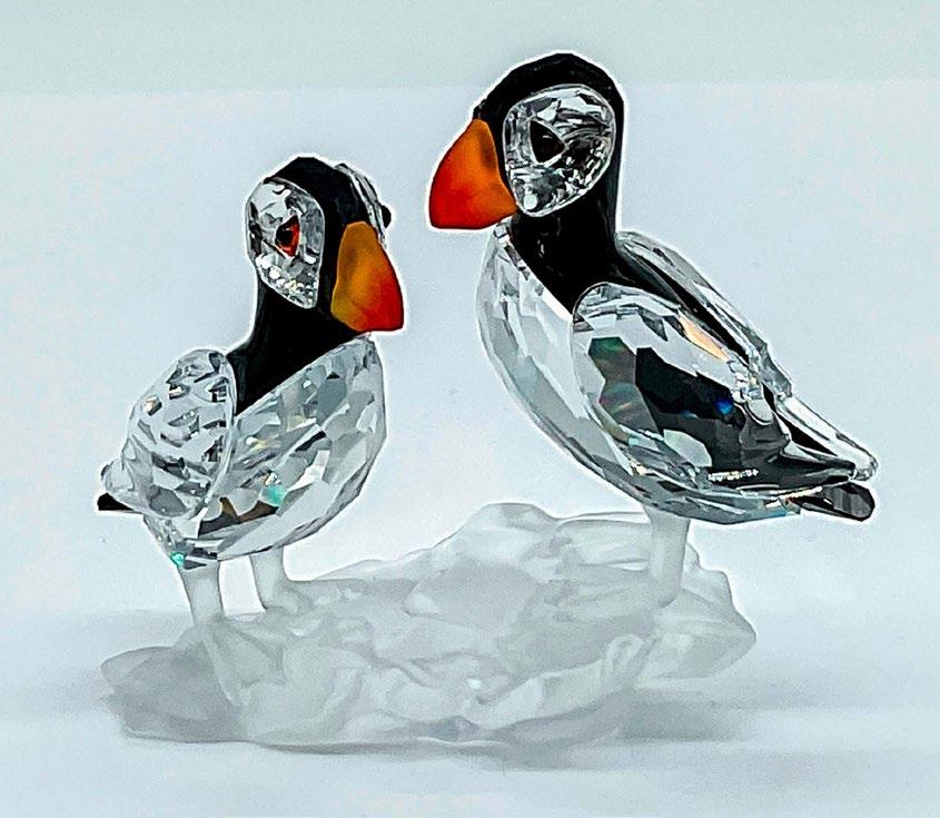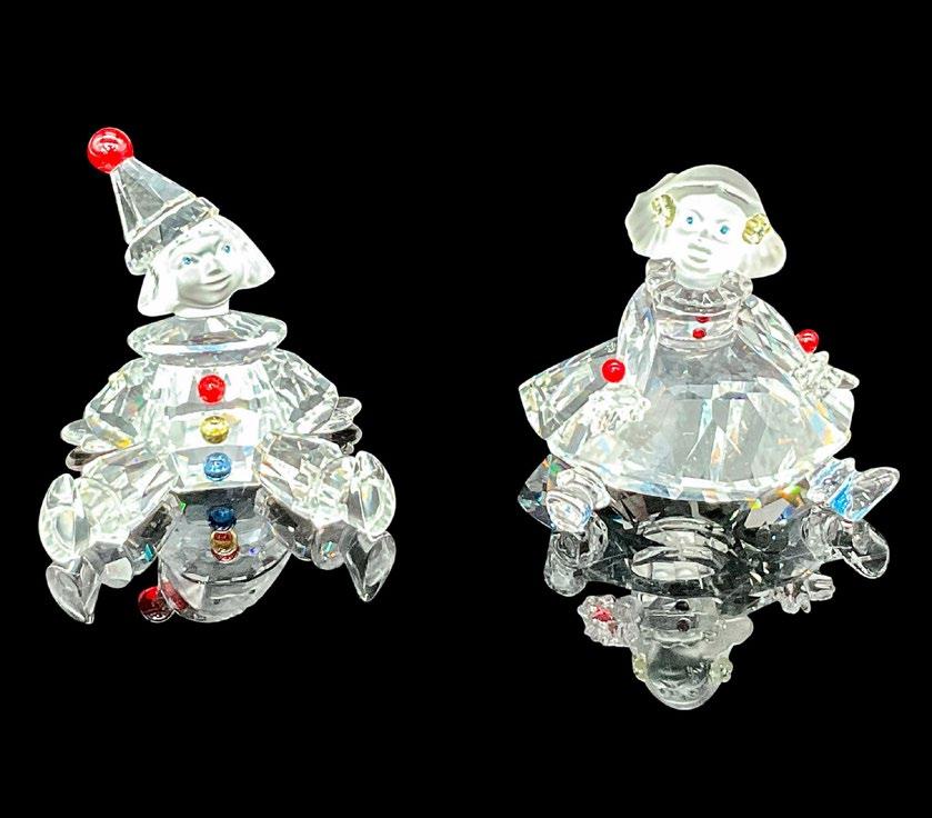 Includes 2 small figures from the ‘Cheerful Times’ collection. Clear crystal body with frosted faces and hair. Adorned with red, blue, and yellow crystal accents. Swarovski etched markings. Puppet: c. 19972008; 2”L x 2”W x 1.75”H. Doll: c. 2003-2008; 1.75”L x 2”W x 1.75”H.
