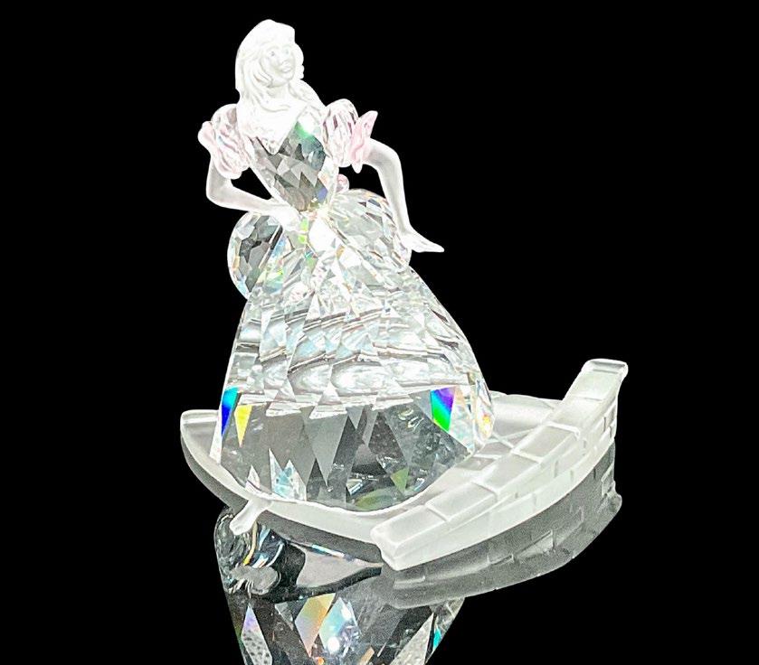Part of the ‘Fairy Tales’ theme group. Figure inspire by the European folk tale, ‘The Little Glass Slipper’. Clear crystal gown with frosted face, arms, and foot. Frosted pink accents on the gown and blue crystal eyes. She is depicted running down a frosted staircase. Swarovski etched marking on the base. This item has its original box: 7.5”L x 8”W x 5.75”H. Slipper not included.