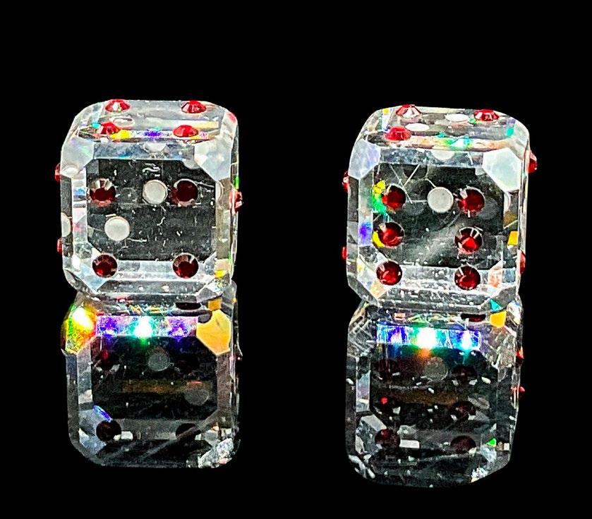 Clear crystal dice with red crystal accents. Swarovski etched backstamp. Includes original box 2.5”H x 3.25”dia.