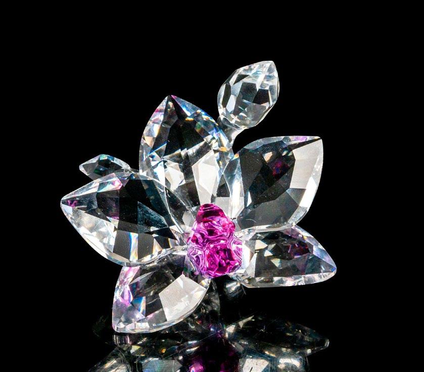 Small blossom surrounded by two small buds in clear crystal and purple heart center. Swarovski crystal acid mark on the base.