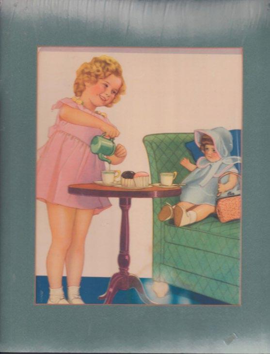 Color enhanced famous print of Shirley as a little girl pouring tea for her doll while wearing a pink dress.