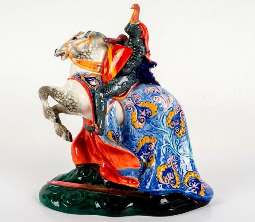 Blue-grey helmet; dark green robes. Don Quixote is the hero of the novel by Cervantes, a satirical parody of this chivalrous knight. Don Quixote leads a life of adventure, capturing many hearts along the way. The helmet color of the jugs varies from dark grey to light grey. Series: Characters From Literature. Royal Doulton backstamp.