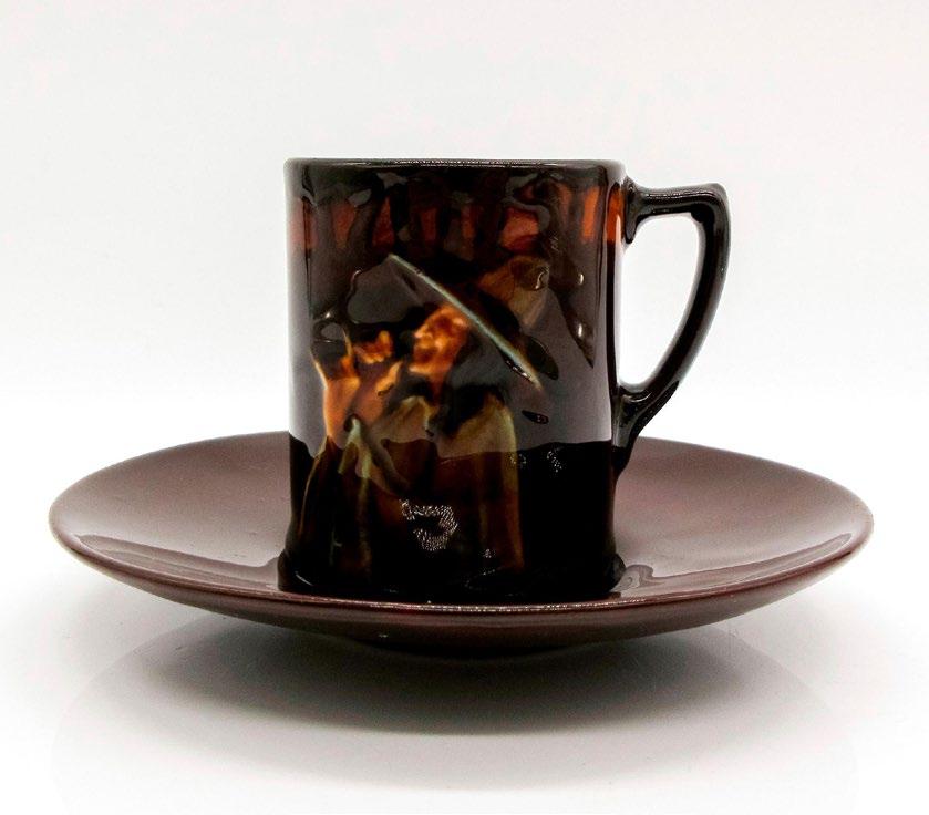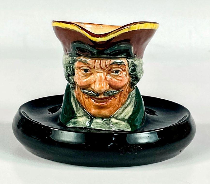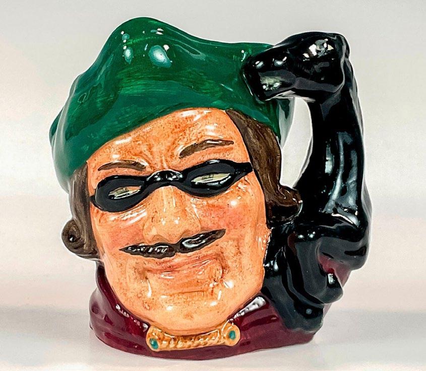Style One. Brown hat; black mask up; green coat; white cravat. Dick Turpin (17051739) joined forces with fellow highwayman Tom King, whom he accidentally shot. Before he died, King betrayed him. The first style of the Dick Turpin jug has the mask up on the brim of the tricorn, and a pistol forms the handle. All of the sizes should have “ R. T. ” inscribed on the pistol grip, however, it may be more obvious on certain jugs due to the casting variations. Royal Doulton backstamp.