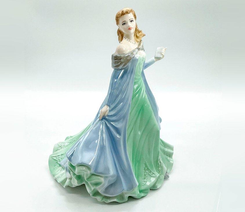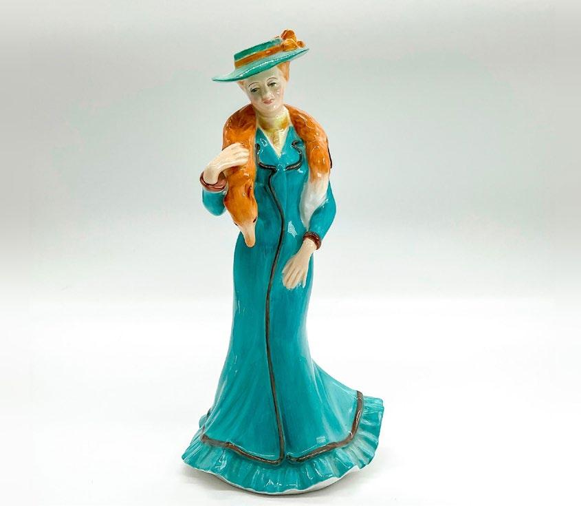 Exquisitely detailed figure modeled as a lady wearing a green gown with matching coat and hand bag. Prototype backstamp. Royal Doulton backstamp.