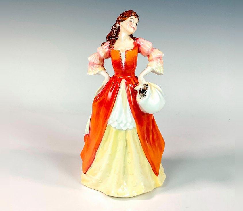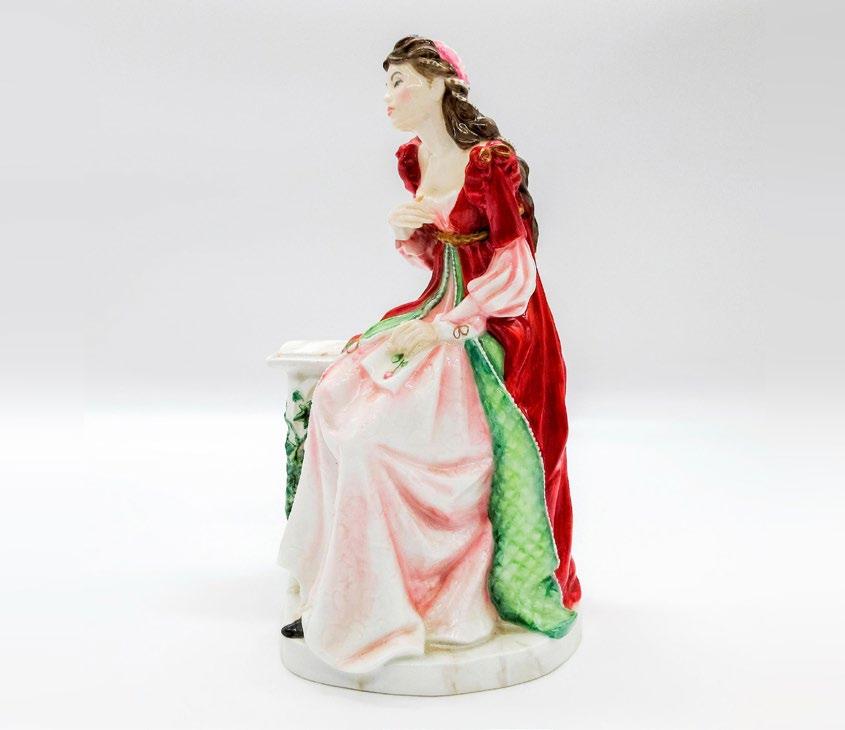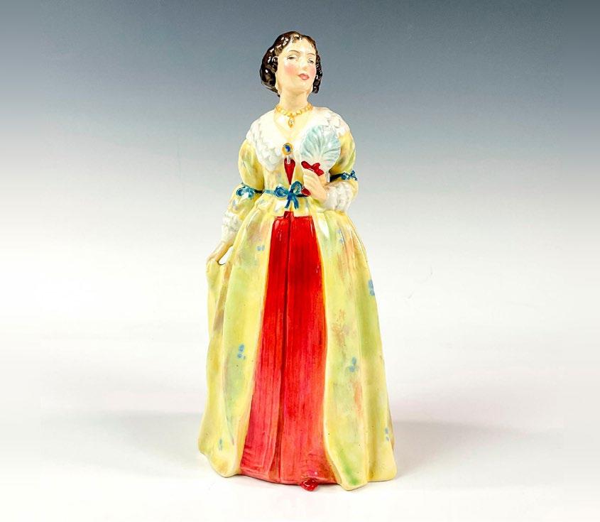 Bone china figure wearing red overcoat and gown lined with ermine fur, holding her matching hat in hand; HN3769. This Item Is The Property of Royal Doulton LTD backstamp. Royal Doulton backstamp.