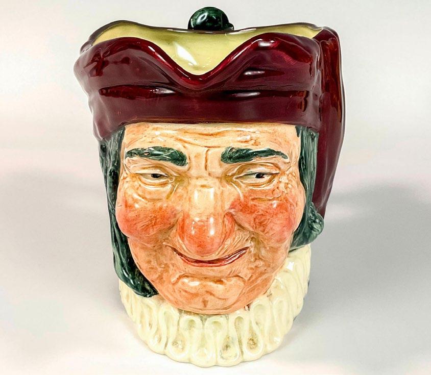 Scarlet robes; purple handle. This jug has minor color variation in the hair. The earliest jugs had brown hair, and later jugs either grey or white hair. This jug was produced with and without pink highlighting on the raised character name. Royal Doulton backstamp.