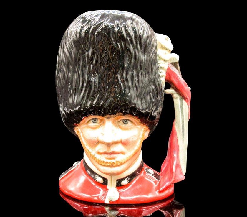 Red tunic; black bearskin hat. Long a fixture in London, the guardsman is easily identified by his tall bearskin hat and scarlet uniform. Today he still stands outside Buckingham Palace to protect the Queen. Guardsman models exist with white (gloss) tunics. Series: The London Collection. Royal Doulton backstamp.