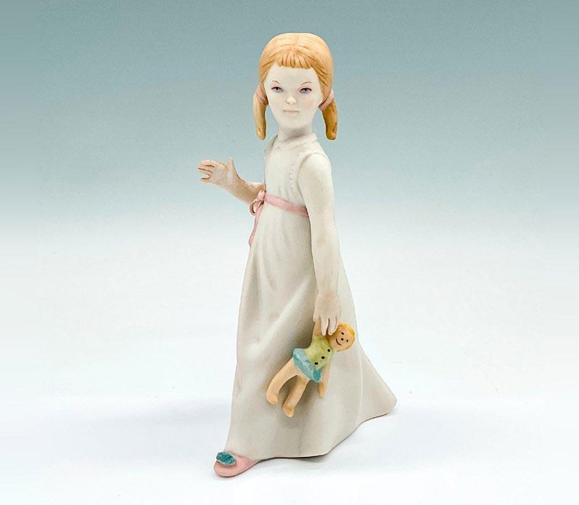 Figure depicting a little girl trying on her mom’s dress, shoes, hat and handbag. Royal Doulton backstamp.