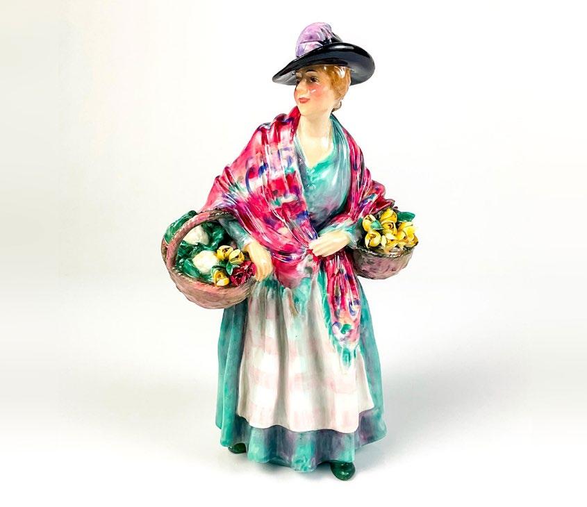 Precious figurine of girl in pink dress holding one chick and two on base. Hat with blue bow hanging on her arm; basket of eggs behind her on a green base. Stamp: Made in England; Royal Doulton England; Bone China. The Property Of Royal Doulton Tableware Ltd. Not Produced For Sale