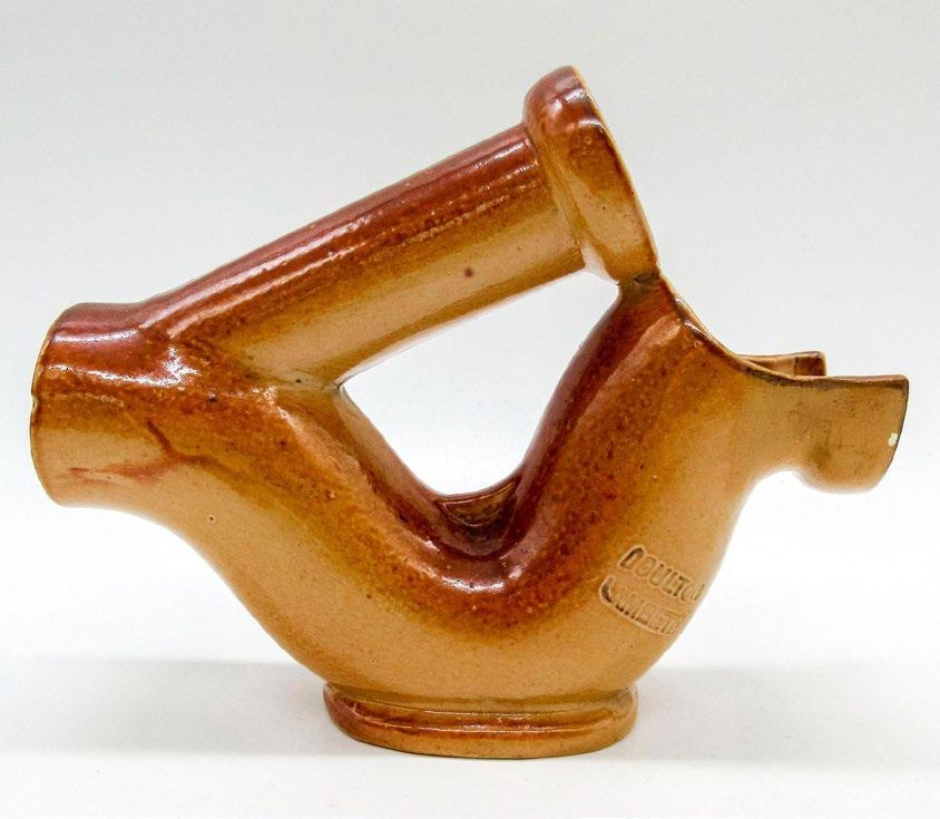 Style Two, neck and head of horse handle. Green tricorn; black mask over the eyes; red jacket. The first style of the Dick Turpin jug has the mask up on the brim of the tricorn, and a pistol forms the handle. All of the sizes should have “ R. T. ” inscribed on the pistol grip, however, it may be more obvious on certain jugs due to the casting variations. This second style of Dick Turpin has the mask covering the eyes, and the handle depicts a horse’s head and neck. Royal Doulton backstamp.