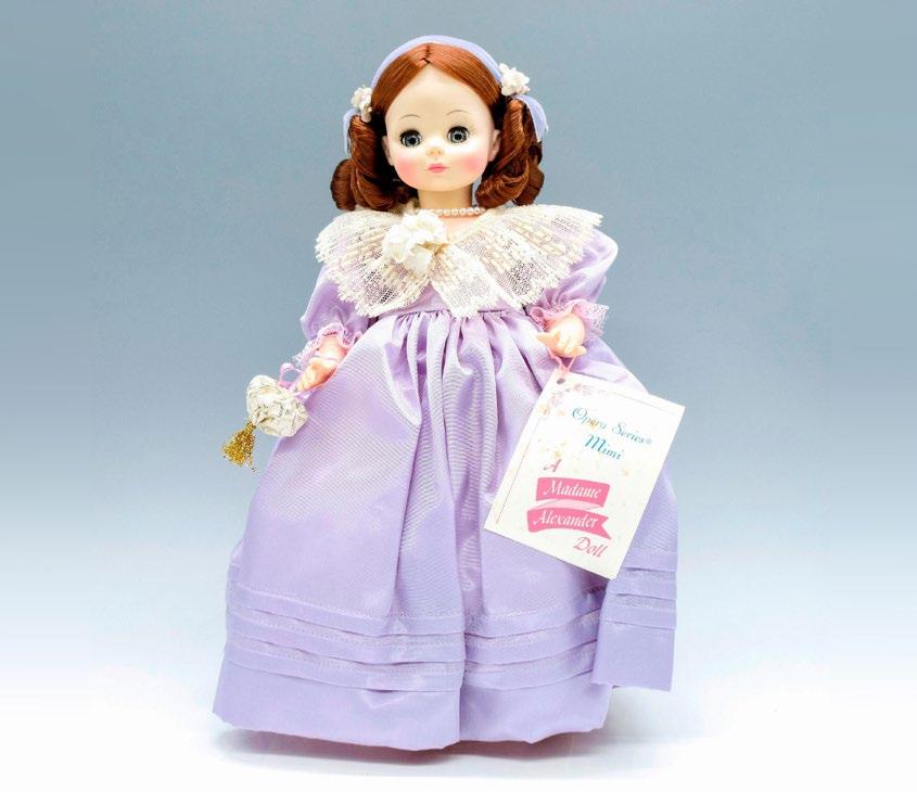 Original replica of Mimi dressed in a purple dress with white lace trimming and velvet headband. wrap. This item has its original box. Certificate of Authenticity included. This item has a base included. This item has its original box. Certificate of Authenticity included. This item has a base included. Box measures: 14”L x 9”W x 4.5”H.