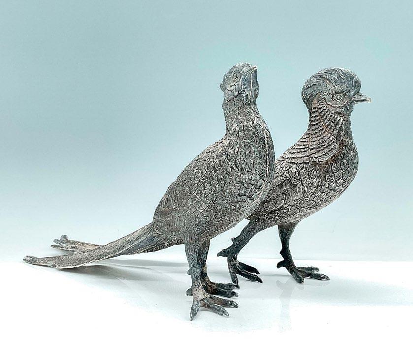 This pair of silver-plated pheasants exhibits intricate detailing, capturing the beauty of their feathers with precision and adding an exquisite touch.