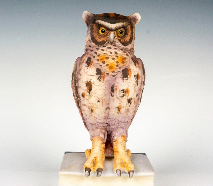 A hand painted vessel depicting an owl standing on two book. Andrea By Sadek factory label.