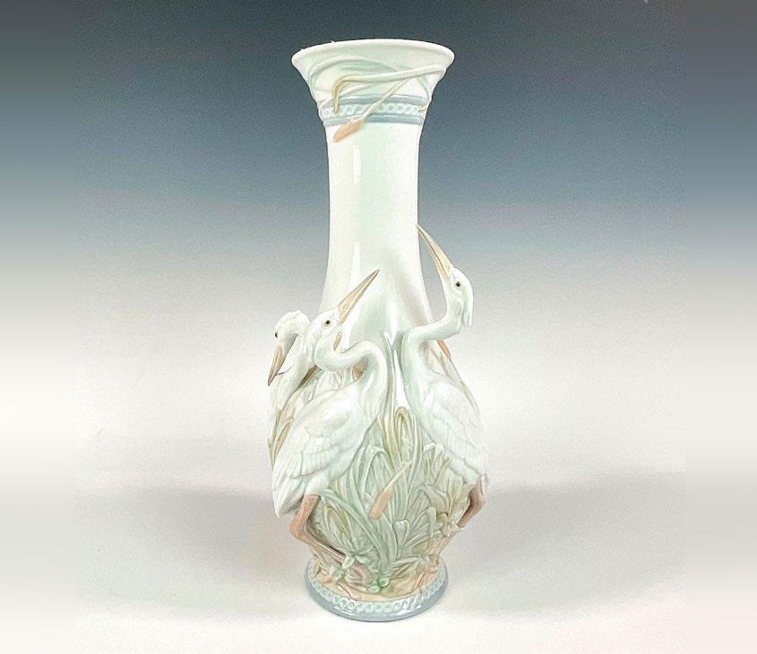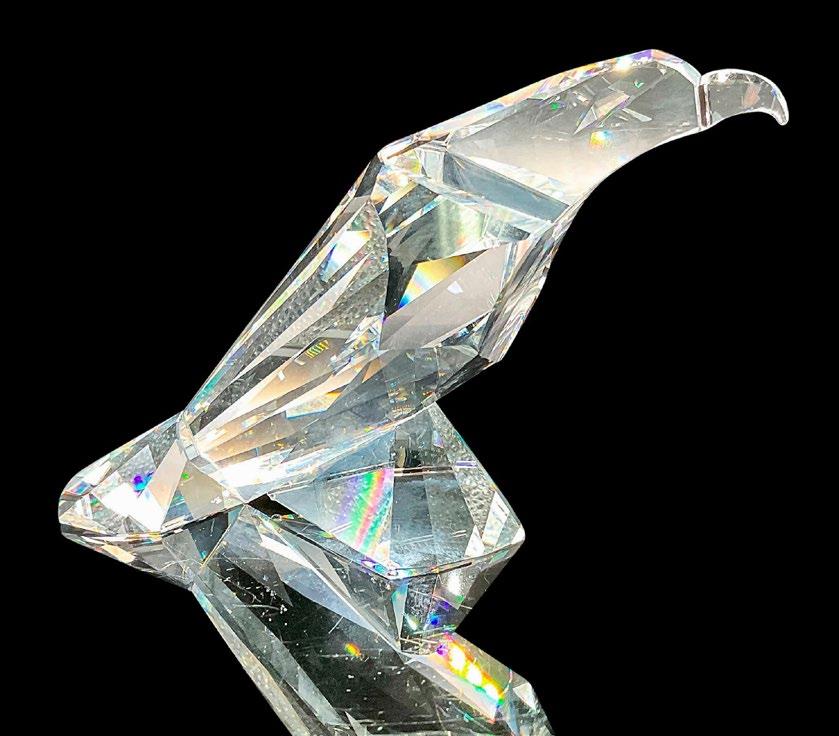 A hand painted vessel depicting a large eagle landing on rocks. Goto Original impressed backstamp.