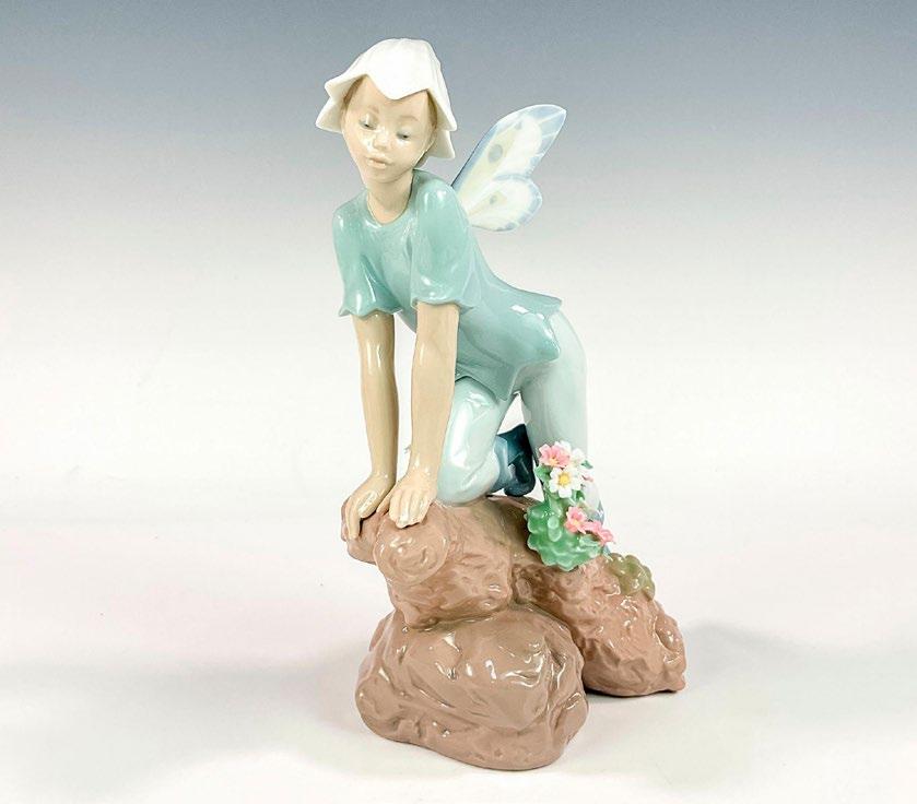 Figure of a boy kneeling by a river bank to cook fish on an open fire in the wilderness. Royal Doulton backstamp.