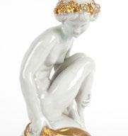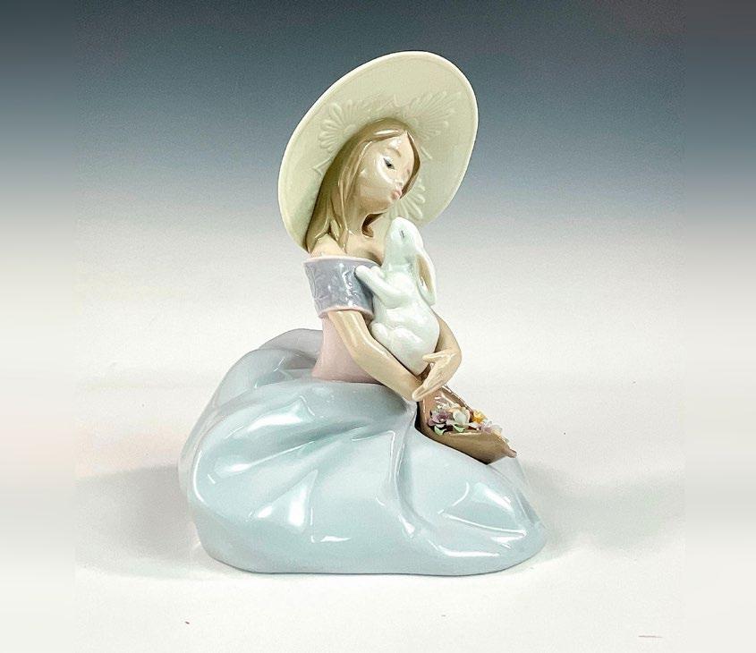 Designed by world renowned sculptor. Features a young woman in peach toned coloration seated with a feline on her lap. Artist name printed to bottom of piece. Goebel Crafts of North America backstamp.