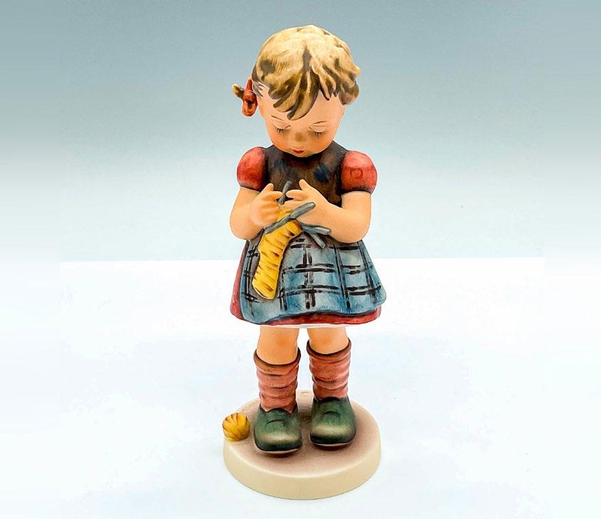 Hand painted in matte finish modeled as a German girl on her way to school. Doll stands on her display stand and carries a basket in hand and backpack on back. M. I. Hummel hang tag. Goebel backstamp.