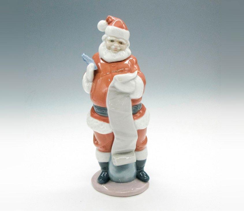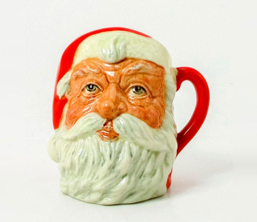 Santa wearing luxurious red coat lined with fur, checking his list, and carrying a sack of presents. Royal Doulton backstamp.