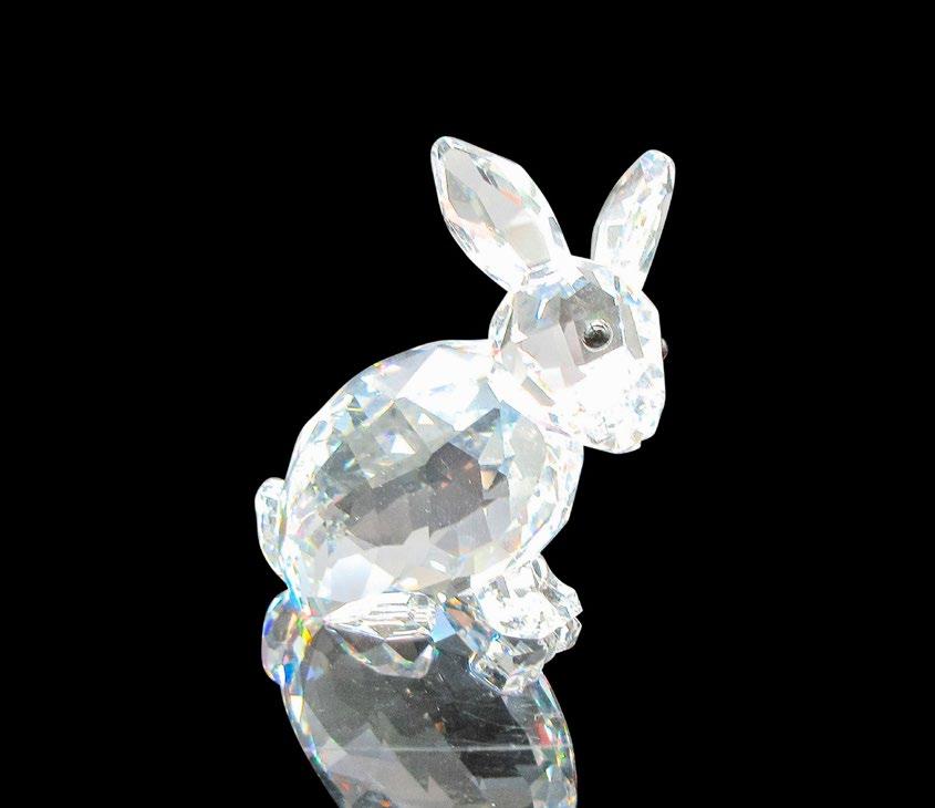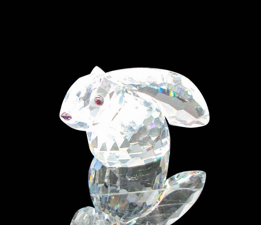 Clear body, large ears and tail. Black crystal eyes. Swarovski backstamp. 7693000012. This item has its original box: 4.75”H x 3.25”dia.