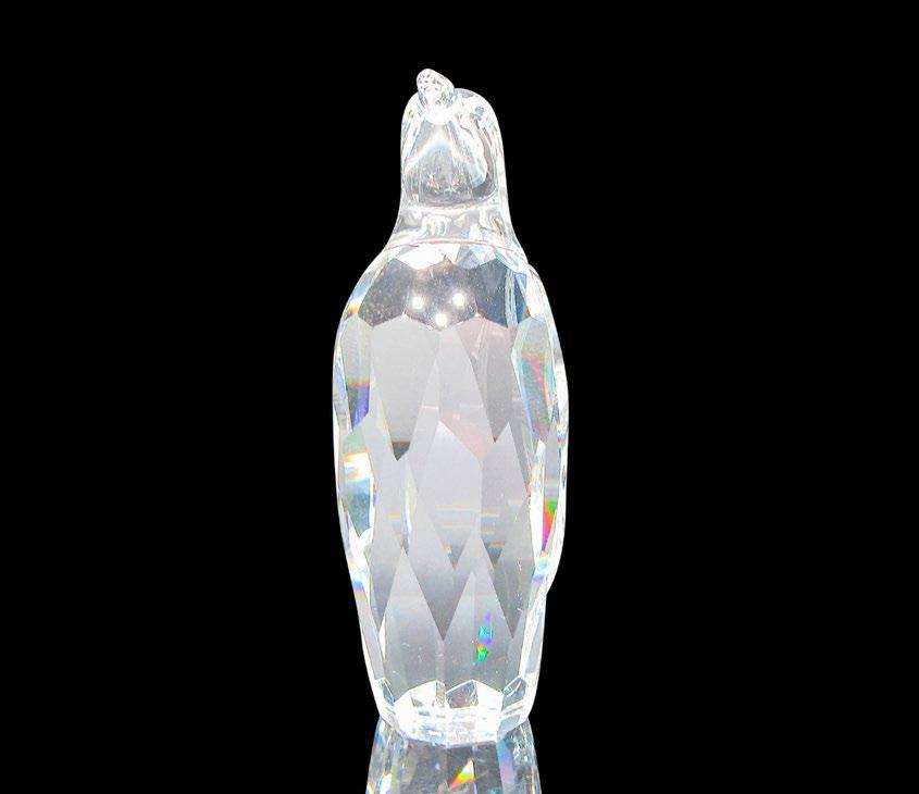 Clear faceted body with colored beak and black beaded eyes. Swarovski backstamp. 7621000009. This item has its original box: 5”H x 3.25”dia.