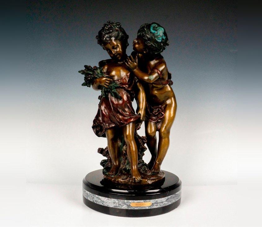 Large bronze sculpture on a marble base of two children whispering. Titled Le Secret. Made in France. Signed to the base.