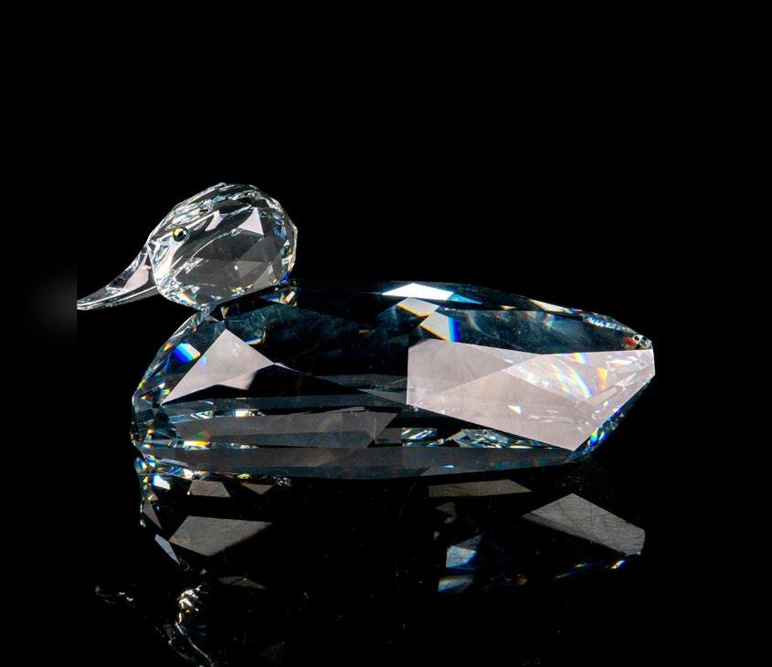 A set of three clear crystal figures, two ducks and a lake for them to be placed upon. Both ducks have clear bodies and brown crystals for eyes, with green, yellow, and brown crystal used for their accents. Swarovski backstamp. Dimensions of the duck figures: 2”L x 1”W x 1.75”H. Dimensions of the lake figure: 3.25”L x 2.25”W x 0.25”H. This item has its original box. Dimensions of the original box: 4.25”L x 4.25”W x 4.25”H.