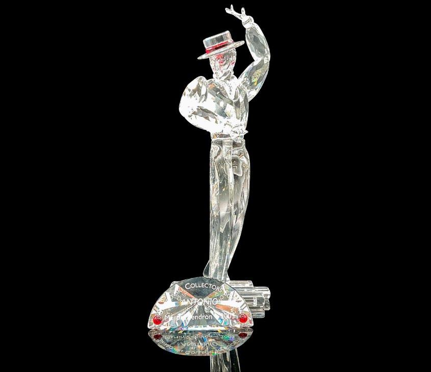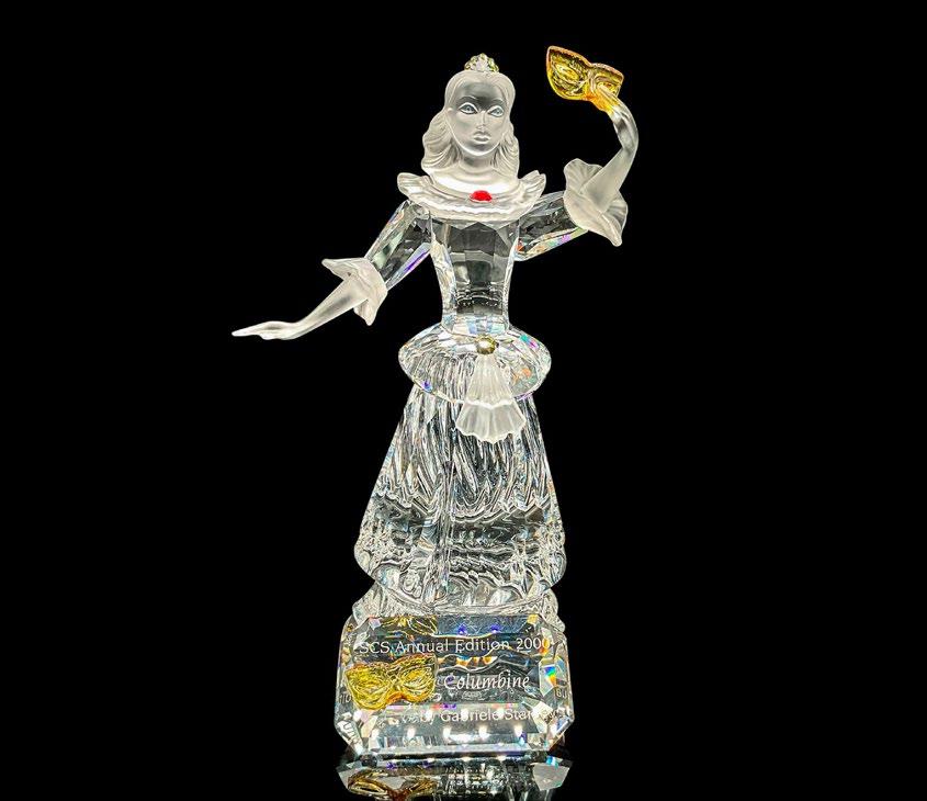 A figure that depicts a female doll with a frosted glass head and red, blue, and yellow crystal used for accessories throughout. Swarovski backstamp. This item has its original box. Dimensions of the original box: 3.75”L x 3.75”W x 2.75”H.