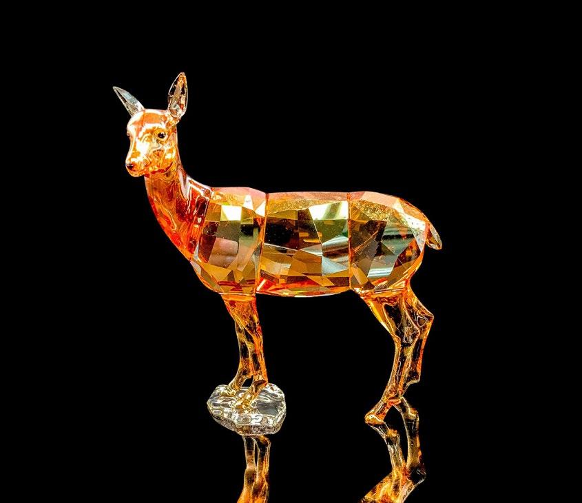 Miniature crystal figurine with crystal body, antlers, and tail standing on all four legs. Black crystal eyes. Part of the Chinese Zodiac group. Swarovski backstamp. 7693000002. This item has its original box: 5”H x 3.25”dia.
