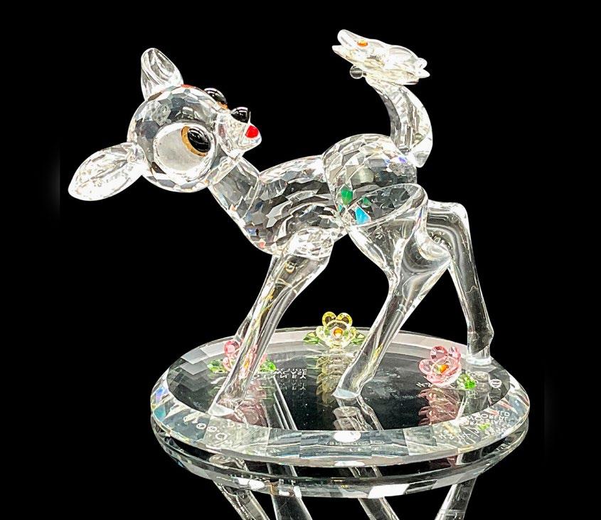 This adorable figurine, embellished with colored crystals, depicts the loveable Bambi staring at a butterfly on his tail. This item has its original box which measures 6”L x 6”W x 4.5”H. Crystal World backstamp.