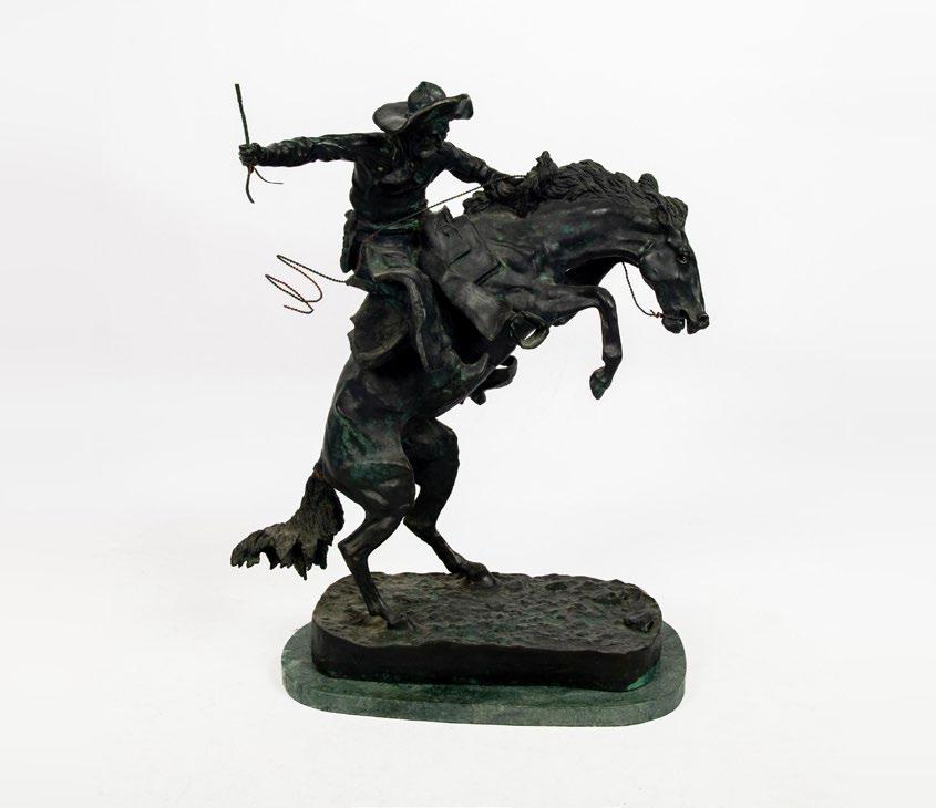 Outstanding bronze sculpture after Frederic Remington’s original 1895 Bronco Buster. It represents a cowboy that tries to contain with ropes a rearing bronco. The details are exceptional and its brown patina tones are splendid. This sculpture is mounted on a marble base. Carved signature on lower left: Frederick Remington. A plaque on the lower right reads: Dedicated to Theodore Roosevelt. 1905.