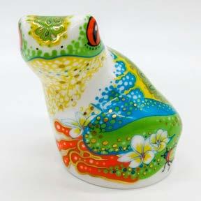 Dressed in colorful dress, jacket, and hat. Hand painted. With tag attached.