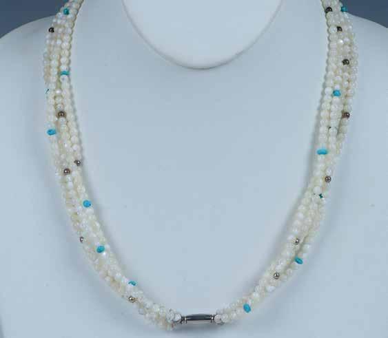 Native American necklace measuring 20”L with black jet and mother of pearl for the owl face, a strip of branch coral as the owl’s nose or beak, tortoise shell for the wings, and a piece of blue turquoise as the tail. The center owl measures 1.5”L x 1.25”W and is signed by the artist on the back. The bracelet contains three beautiful inlaid owls that consist of mother of pearl, brown shell, coral and turquoise. It contains a double silver shank cuff measuring 1.5”W and the inside end to end measures 5.5”L. 50g