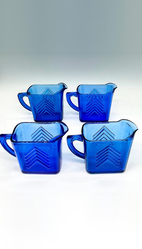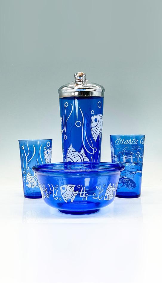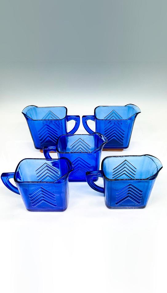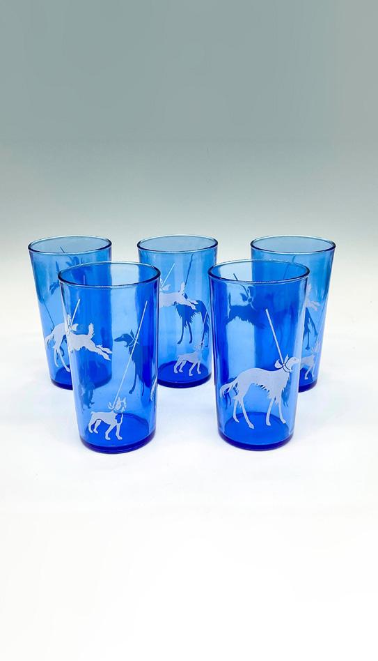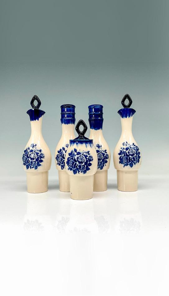 Hand painted ceramic with deep blue glaze and floral pattern. Salt, pepper, oil, vinegar, and mustard bottle largest with dimensions 8”H x 2.25”dia.