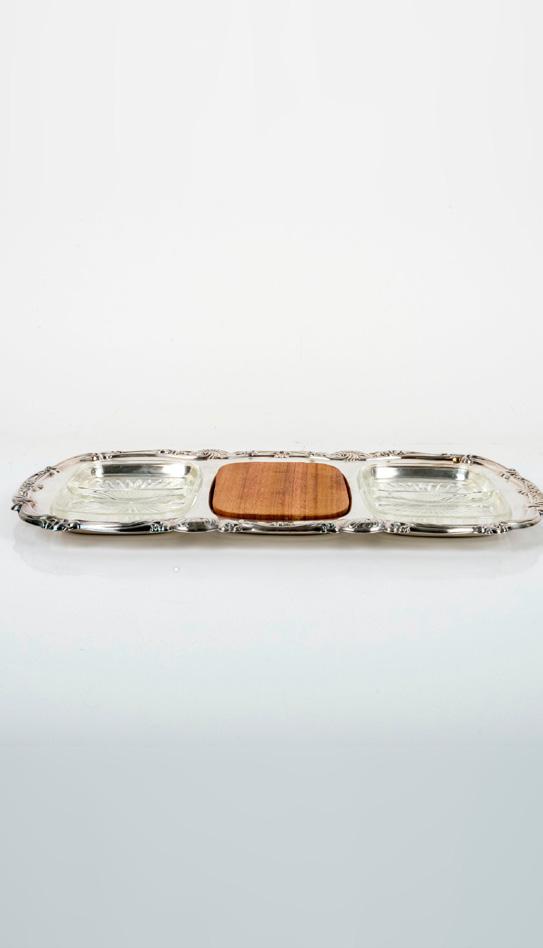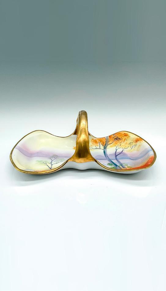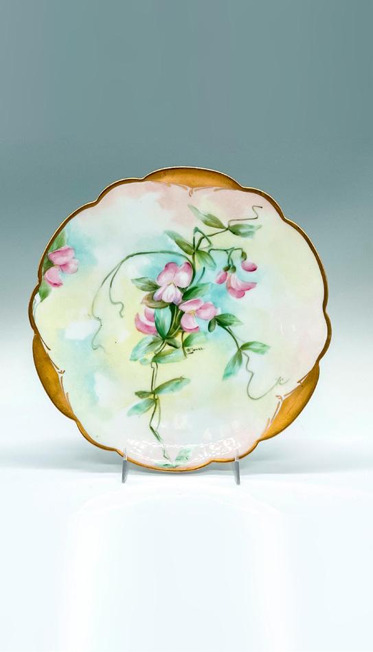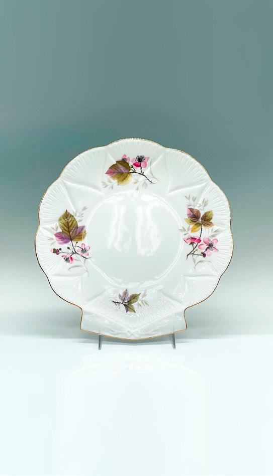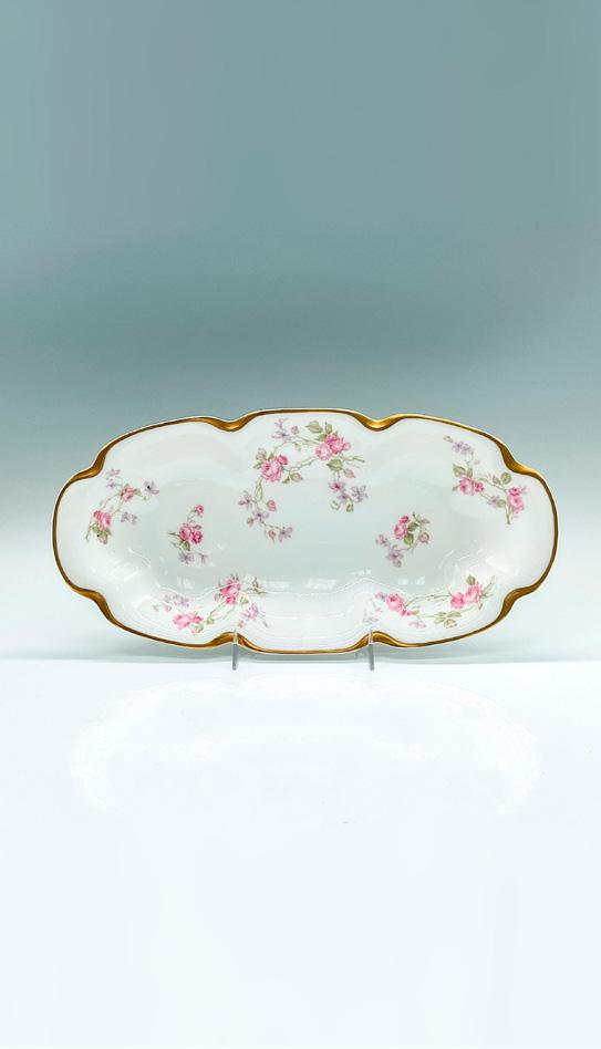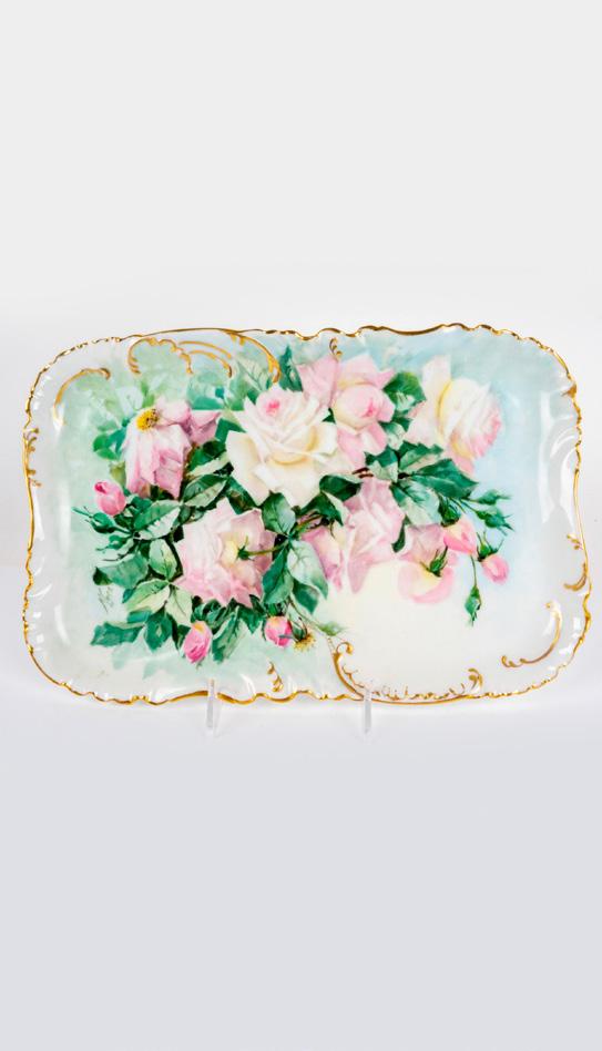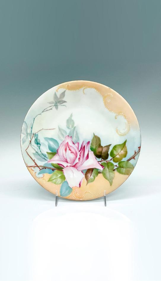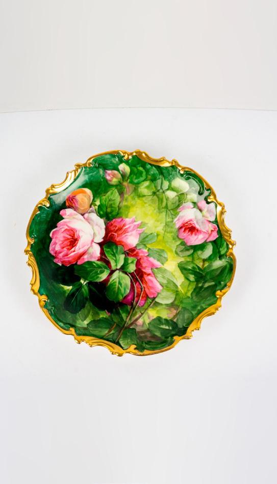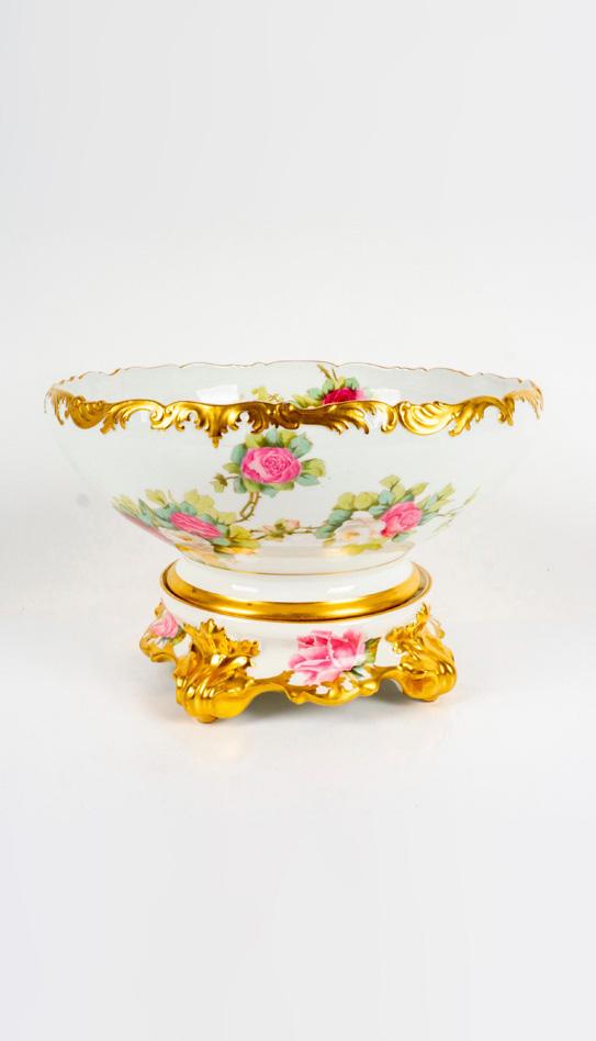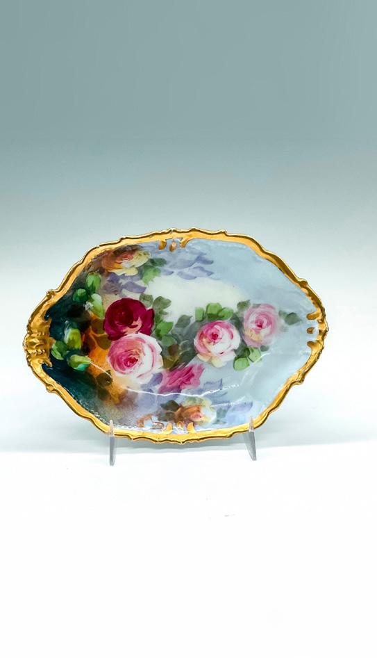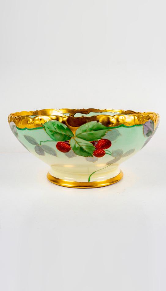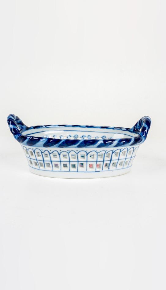 A dish molded as a basket depicting painted fruits on interior. Monogram on the base.