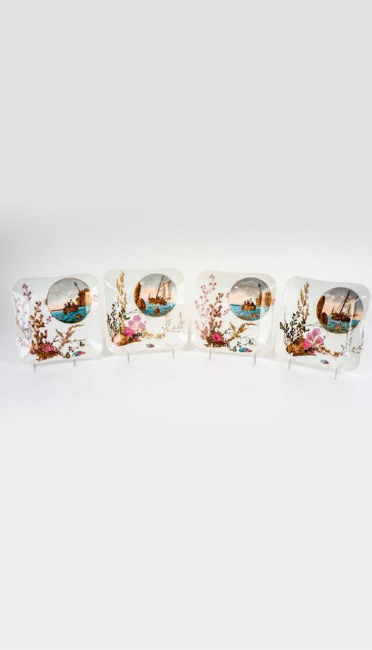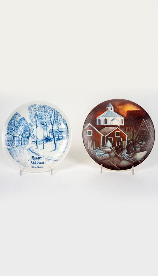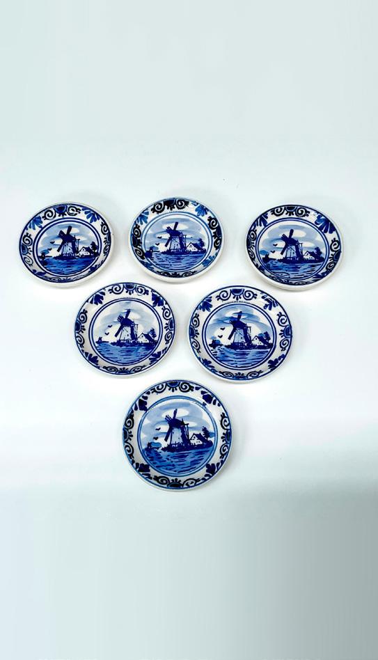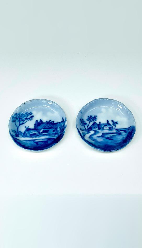 Tiny plates painted with windmill scene, intended for a child’s tea set.