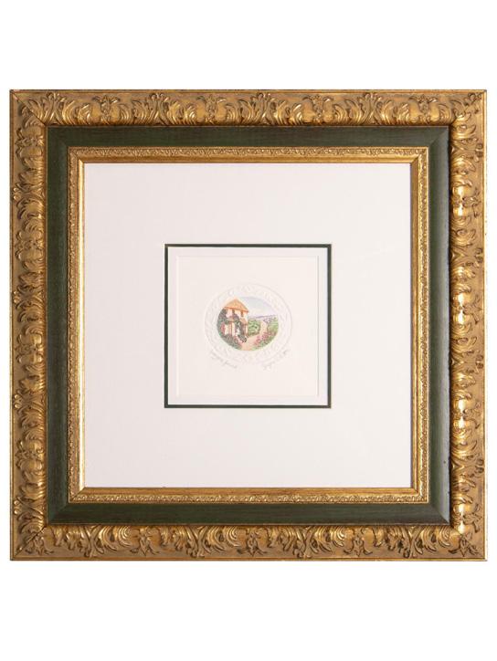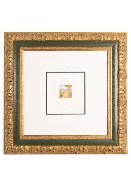 Titled: Road to the Cottage. Etching with embossed edges of flowers and leaves. Artist signed in pencil lower right. Housed in gold frame with green trim and cream colored matte. Sight size: 5”H x 5”W.