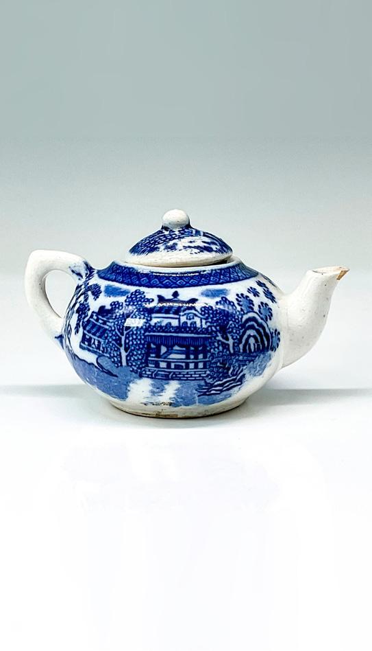 Tiny porcelain tea pot with Blue Willow transfer pattern marked Staffordshire.