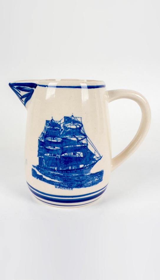 Large stoneware jug with blue underpaintings depicting a sailboat titled “Wanderer” and small farm with a windmill on the reverse.