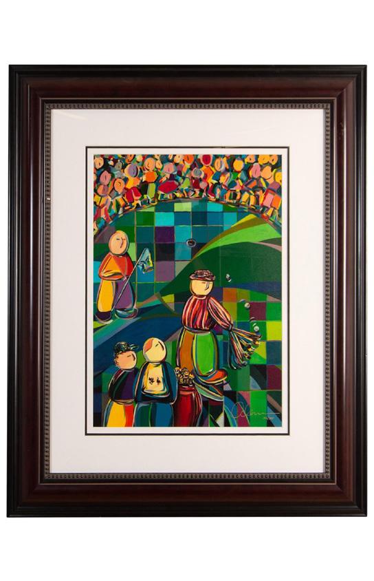 Limited edition Serigraph embellished Giclee. Artist signed and numbered lower right. Housed in dark wood frame with cream colored matte. Sight size: 17.5”H x 13”W. Frame size: 31”H x 26”W.