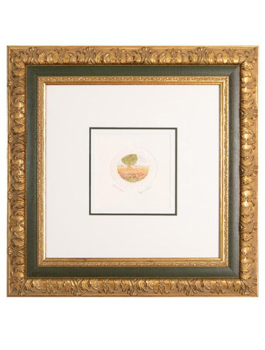 Etching with embossed edges of flowers and leaves. Artist signed in pencil lower right. Housed in gold frame with green trim and cream colored matte. Sight size: 5”H x 5”W.