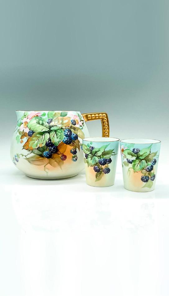 Set of 6 demitasse cups with covered coffee pot. White ground depicting Japanese landscape in blue. “Made in Japan” stamped on coffee pot base. Coffee pot: 7”L x 2.75”W x 7”H. Cups: 3”L x 2.25”W x 2”H.