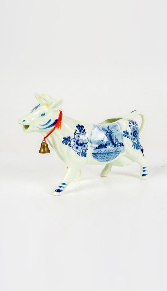 Beautiful lightweight porcelain creamer modeled as a cow with mouth spout and tail handle. Blue floral and windmill scene; adorable metal bell tied to neck. DBL marked to base.