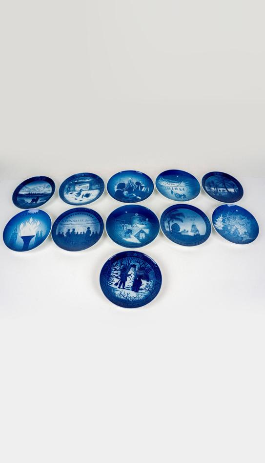 Includes In the Old Farmyard, Christmas at Home, In the Desert, Copenhagen Christmas, The Last Umiak, James Cook, Olympic Games Munich 1972, Christmas In Greenland, United States Bicentenary, Christmas Peace, and The Snowman. Royal Copenhagen backstamp. Largest plate measures: 7.25”dia.