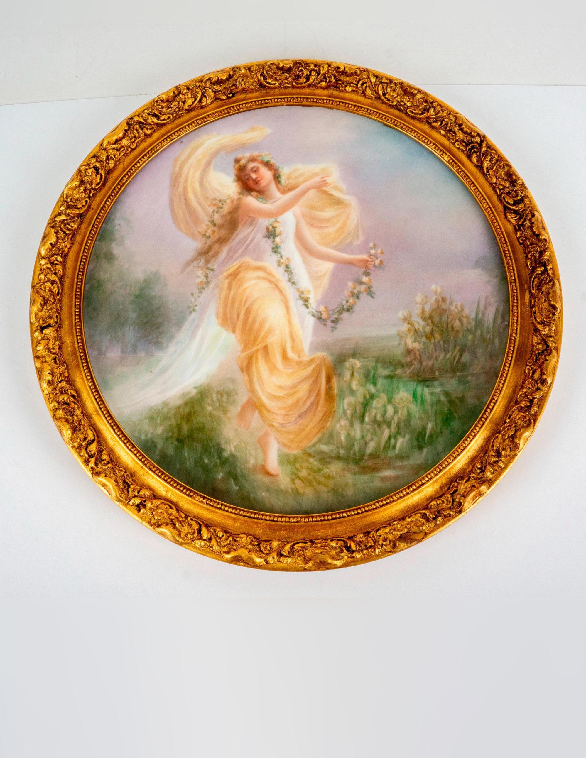 Housed in a gilded-gold carved circular wooden frame. Depicts a neoclassical style