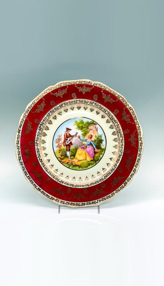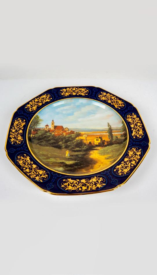 Limited edition porcelain cabinet or wall plate hand decorated with a scene of villagers gathered together after a long day. Artist signed to lower right side. Delfts backstamp.