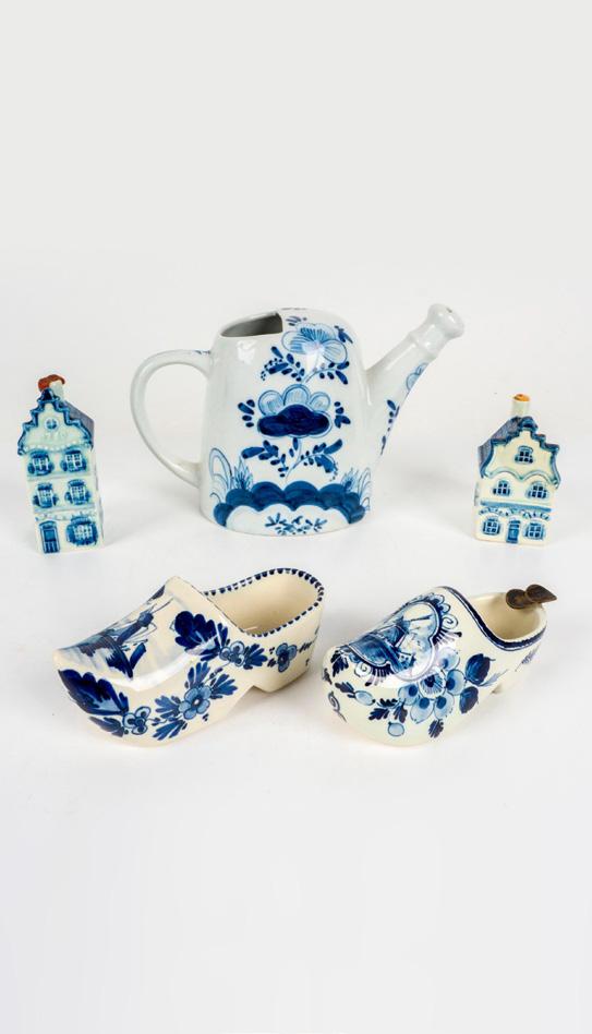 Includes 2 hand decorated Holland house sealed figural bottles made by Delft and KLM for Rynbende Distilleries of Holland containing liquid, 2 shoe figures with hand painted floral motifs, and a decorative watering can with foliage motif. Hand written Delft backstamp. Largest figure measures: 7.5”W x 4.5”H.