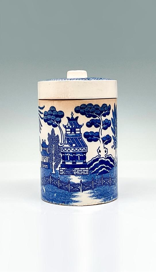 Ceramic jar and tight-fitting lid to store loose tea, with side slot for measuring teaspoon. Decorated with Willow transferware pattern on the exterior.
